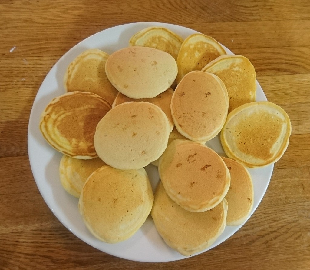 Heat a large frying pan and grease with a little oil. Drop spoonfuls of the batter into the pan and sprinkle a few raisins/sultanas on the top. When you can see lots of small holes appearing on the drop scones, turn them over and cook for a minute or so on the other side. Repeat until you have used all the batter. These freeze really well.